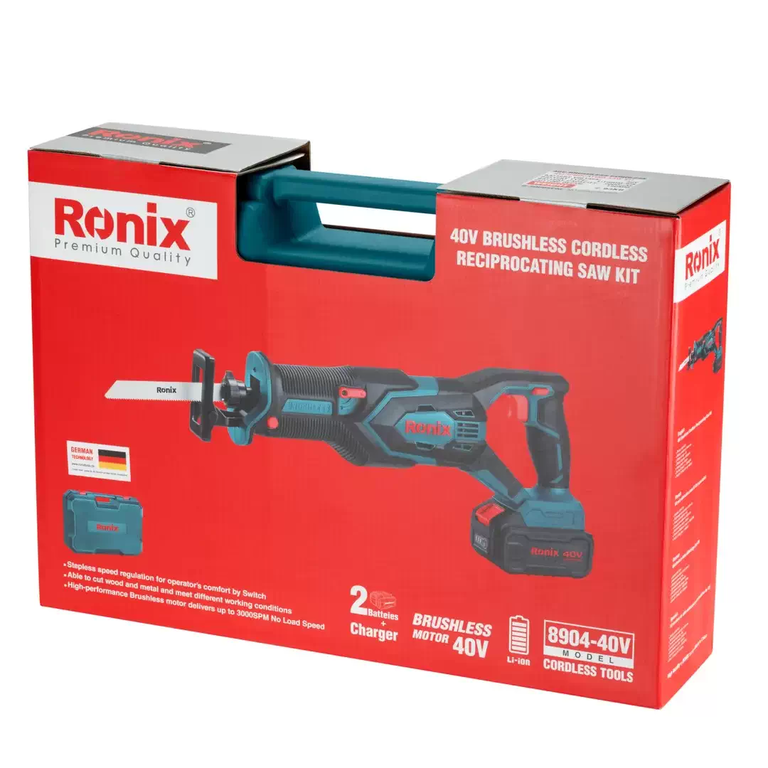 اره افقیبر شارژی 40 ولت رونیکس مدل 8904 با موتور براشلس قدرتمند 40 ولتی تا 3000 حرکت رفت و برگشتی در دقیقه را انجام میدهد. طراحی سبک و ارگونومیک این ابزار، باعث لرزش بسیار کم این ابزار میشود و دسته خوشدست آن، کنترل بیشتر و خستگی کمتر در حین کار را به همراه دارد.