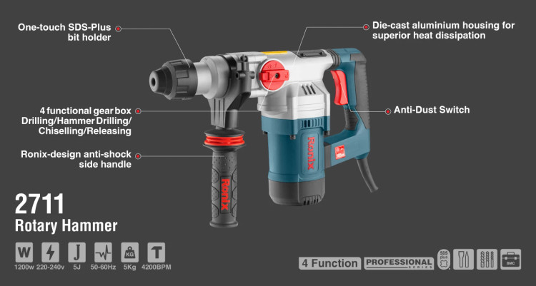 بتنکن 32 میلیمتری رونیکس با مدل 2711، مجهز به موتور گیربکسی صنعتی و قدرتمند 1200 وات است که سرعتی بالغ بر 1050 دور بر دقیقه را ایجاد میکند و نرخ ضربه آن 4200 ضربه بر دقیقه است. مجموعه ابزارگیر این دستگاه، چهارشیار (SDS PLUS) و ضد غبار با ظرفیت 32 میلیمتر بوده و متناسب با سطوح چوبی، فلزی و بتنی طراحی شده است.
