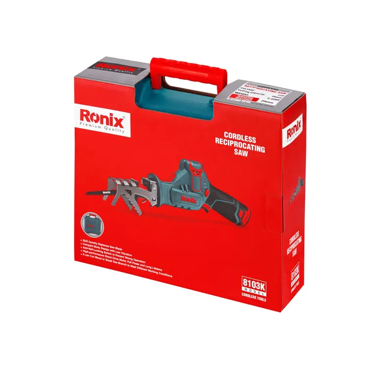 طراحی اره همهکاره یا افقیبر شارژی 8103K رونیکس و ساختار لولهایشکل آن، استفاده از این ابزار را در فضاهای با دسترسی محدود امکانپذیر میکند. این اره به یک موتور 12 ولت DC کوچک اما قدرتمند و با راندمان بالا تجهیز شده است. در این محصول شارژی، از باتری لیتیوم یون 12 ولت با ظرفیت 2 آمپرساعت به عنوان منبع تغذیه استفاده میشود. ابزارگیر این اره افقیبر، اتوماتیک بوده و تعویض سریع و آسان تیغه را برای کاربر امکانپذیر میکند. افزونبراین، در قسمت بالایی این ابزارگیر، میتوان پایهای را برای باغبانی و شاخهزنی نصب کرد.